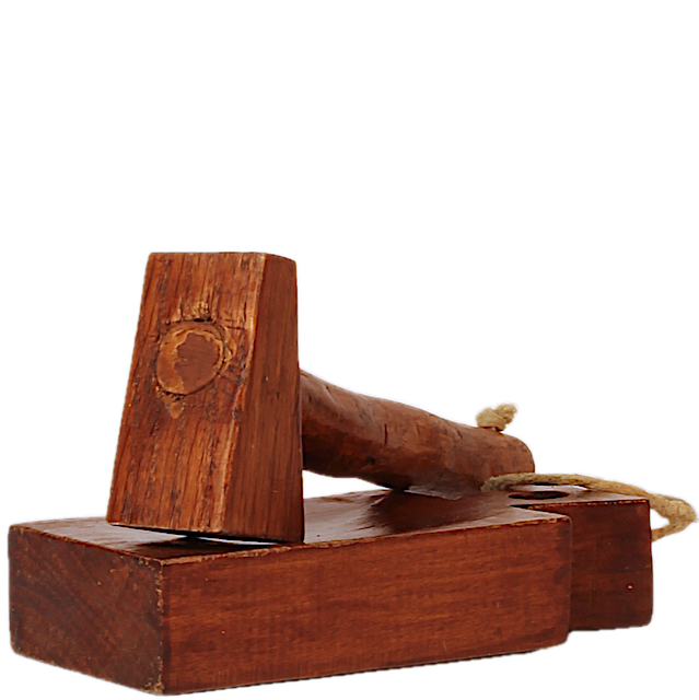 Schiaccianoci in legno composto da taglierino e martello legati da spago, costruito a mano.